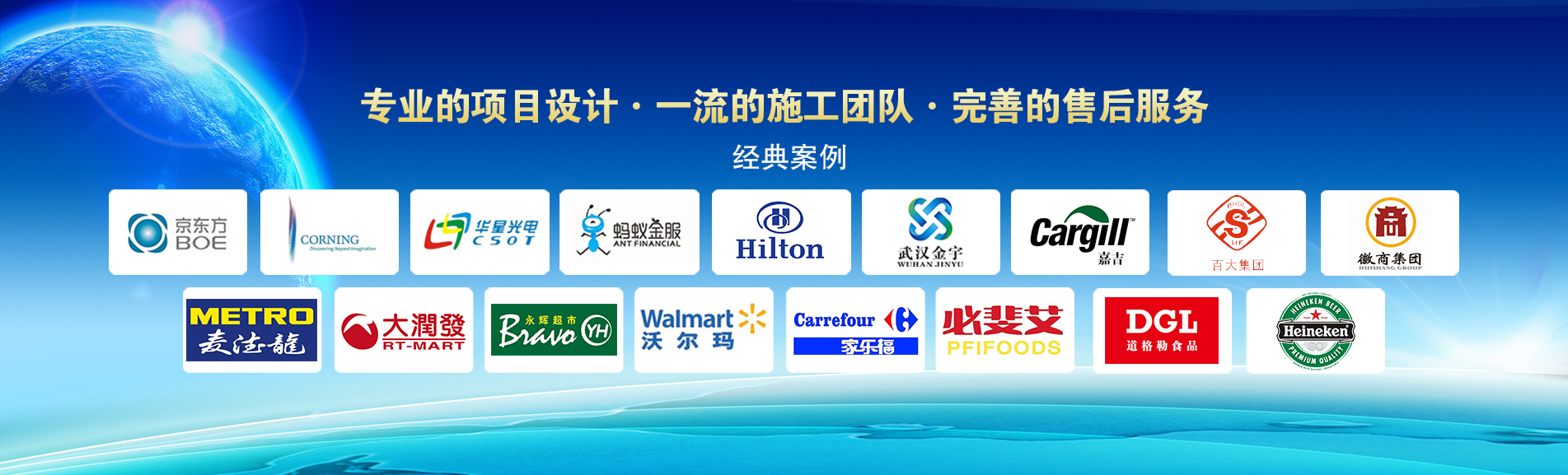 冷凍冷藏設(shè)備大型冷庫項(xiàng)目:   武漢中百物流冷庫(40000㎡)、蘇州、北京普洛斯大型物流庫(17000㎡)、沈陽佳德物流冷庫(20000㎡)、上海東航配餐物流庫(6000㎡)、杭州華商勾莊物流冷庫(24000㎡)、安徽安心蔬菜綠色食品冷庫(12000㎡)、武漢金宇冷庫(35000㎡)、必斐艾食品廠(14000㎡)、中國-東盟(百色)農(nóng)產(chǎn)品交易中心冷庫物流工程(30000㎡)、遵鐵物流冷鏈物流區(qū)建設(shè)項(xiàng)目中心冷庫物流工程(16500㎡)、長沙云冷產(chǎn)業(yè)園冷庫物流工程(21000㎡)等;大型中央空調(diào)項(xiàng)目:   武漢康寧顯示玻璃廠廠房、武漢京東方模組廠房、武漢華星光電模組廠房、深圳華星光電模組廠房,杭州阿里巴巴辦公樓,舟山波音737機(jī)場(chǎng)辦公樓,南京江北能源站、上海金融大酒店等